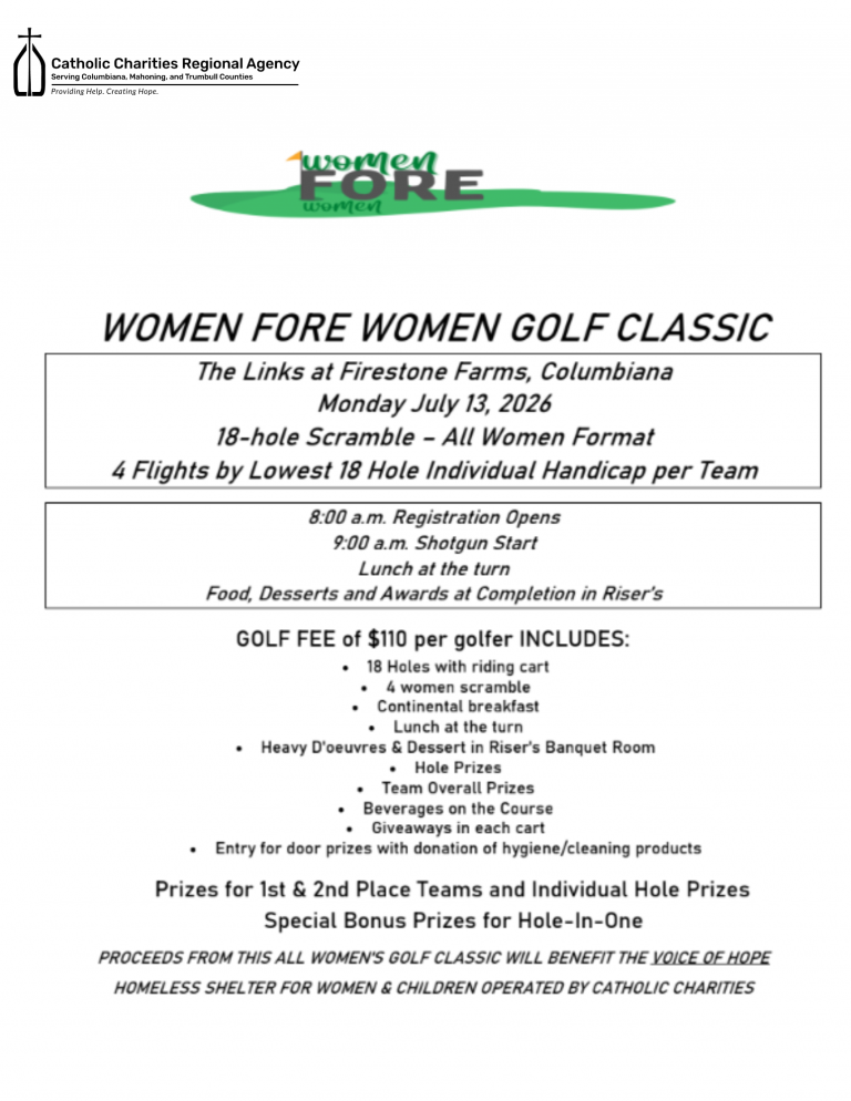 Catholic Charities Regional Agency Announces 2026 Golf Classic! Registration is now open!Please call if you have any questions: 330-744-3320.When: Monday July 13, 2026Where: The Links at Firestone Farms, Columbiana, Ohio. 105 St Andrews Dr, Columbiana, OH 44408What: 18 Hole Scramble – All Women Format(3 flights by lowest team member’s 18 Hole Handicap)Shotgun Start Time: 9:00am*Lunch at the Turn**Food, Dessert and Awards on Completion in Riser’sInterested in becoming a Sponsor? Call 330-744-3320. Sponsorship Form Proceeds from this all women’s golf classic will benefit the Voice of Hope Homeless Shelter for Women & Children operated by Catholic Charities Regional Agency. For any questions or concerns, call 330-744-3320. Share this page FacebookTwitterLinkedIn